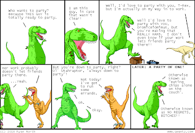 Since I already did T-Shirt Thursday yesterday (which was Wednesday but that doesn’t matter coz T-Shirt Thursday can fall on any other day I want and it will still have Thursday in its name even though it’s a different day and if you’re still reading this very long sentence, WOW.), I’ll just share today’s episode of Dinosaur Comics: